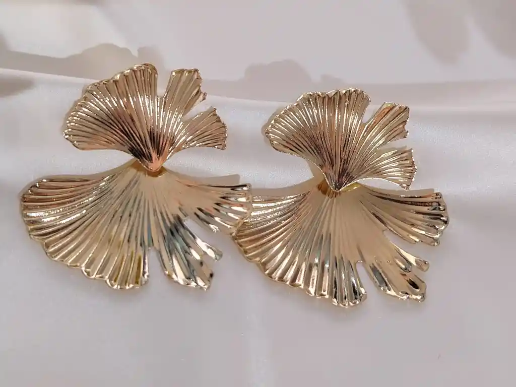 Aretes dorados inspirados en la hoja de ginkgo, elegantes y ligeros.