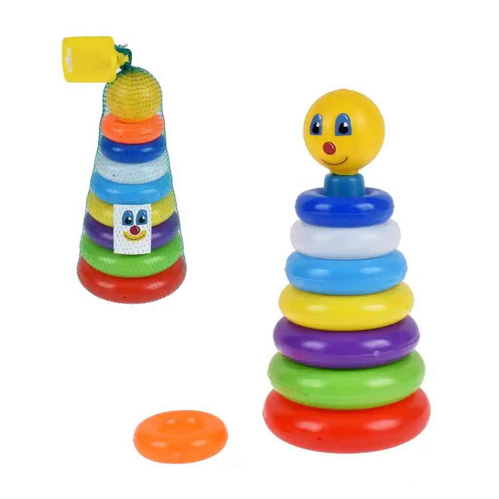 Clásico juego apilable. Cuenta con siete aros de diferentes tamaños y colores, estimulando el desarrollo motor de los pequeños.
