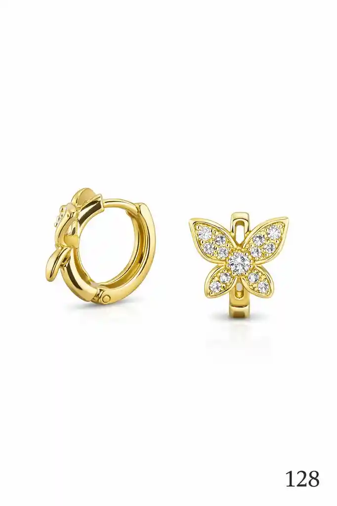 Argollas con mariposa llena de micro circones laminado en oro de 18k mide 1cm.