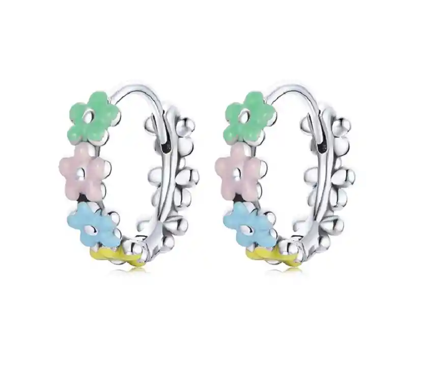 Una joya must have si eres fanática las cosas hermosas, el modelo clásico de argollas con un tierno decorado de flores esmaltadas en colores pasteles. Ideales para las chiquillas del hogar y para las más grandes también. La delicadeza de la joya hará que no pases desapercibida, haciéndolas únicas como tú y definitivamente no deben faltar en tu joyero. Tan versátil que puedes llevarlo a una salida con amigas o tu pequeña al parque de juegos, haciéndolas cómplices y aliadas. El accesorio ideal para enmarcar tu rostro. Tamaño ideal para combinar con otros pendientes, así potenciar tu look. Fabricados en plata fina ley S925 con esmaltado de colores pasteles muy resistente. Muy livianas, ¡Te encantaran! Material: Plata fina ley S925, sin níquel. Ideal para pieles sensibles. Diámetro: 13mm x 4mm de grosor Peso aprox: 7,2g (Se envía con bella caja de regalo)