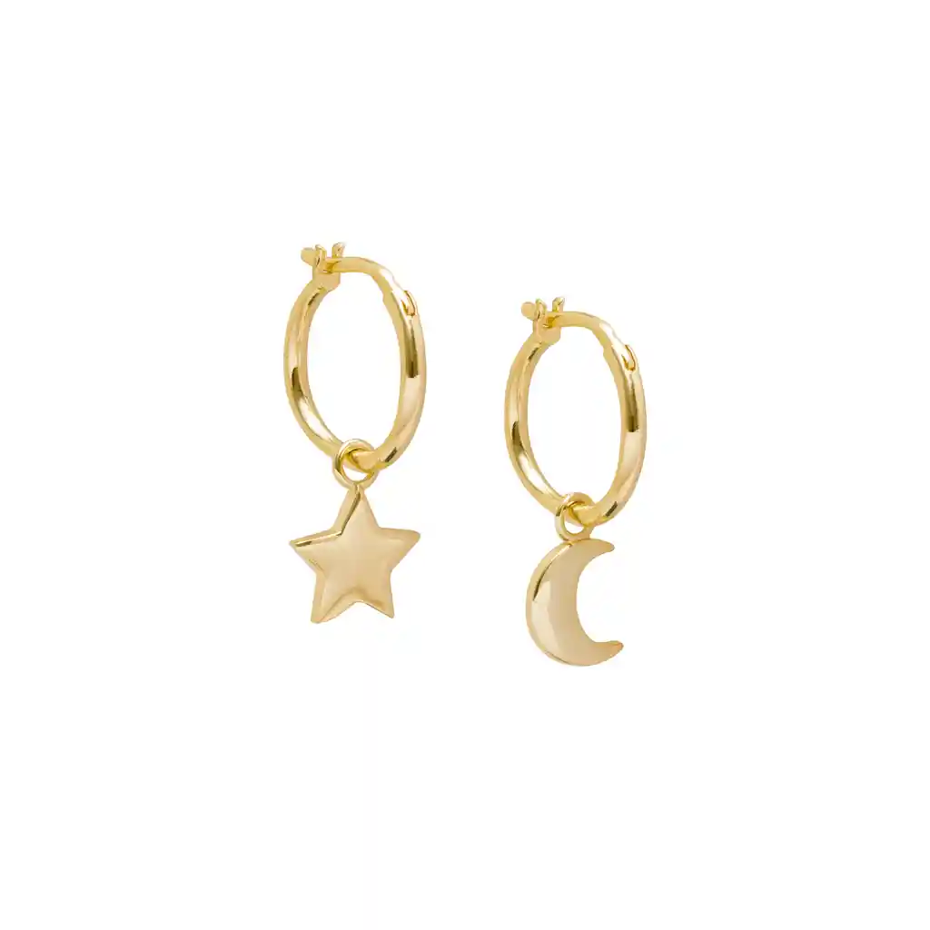 Estas argollas contienen un colgante de estrella y otro de luna, puedes usarlos con los colgantes o solos! Además son fabricados en baño de oro de 14k. Sin duda le darán un toque a tu outfit. ¡Todas nuestras joyas vienen con un packaging especial que te enamorar