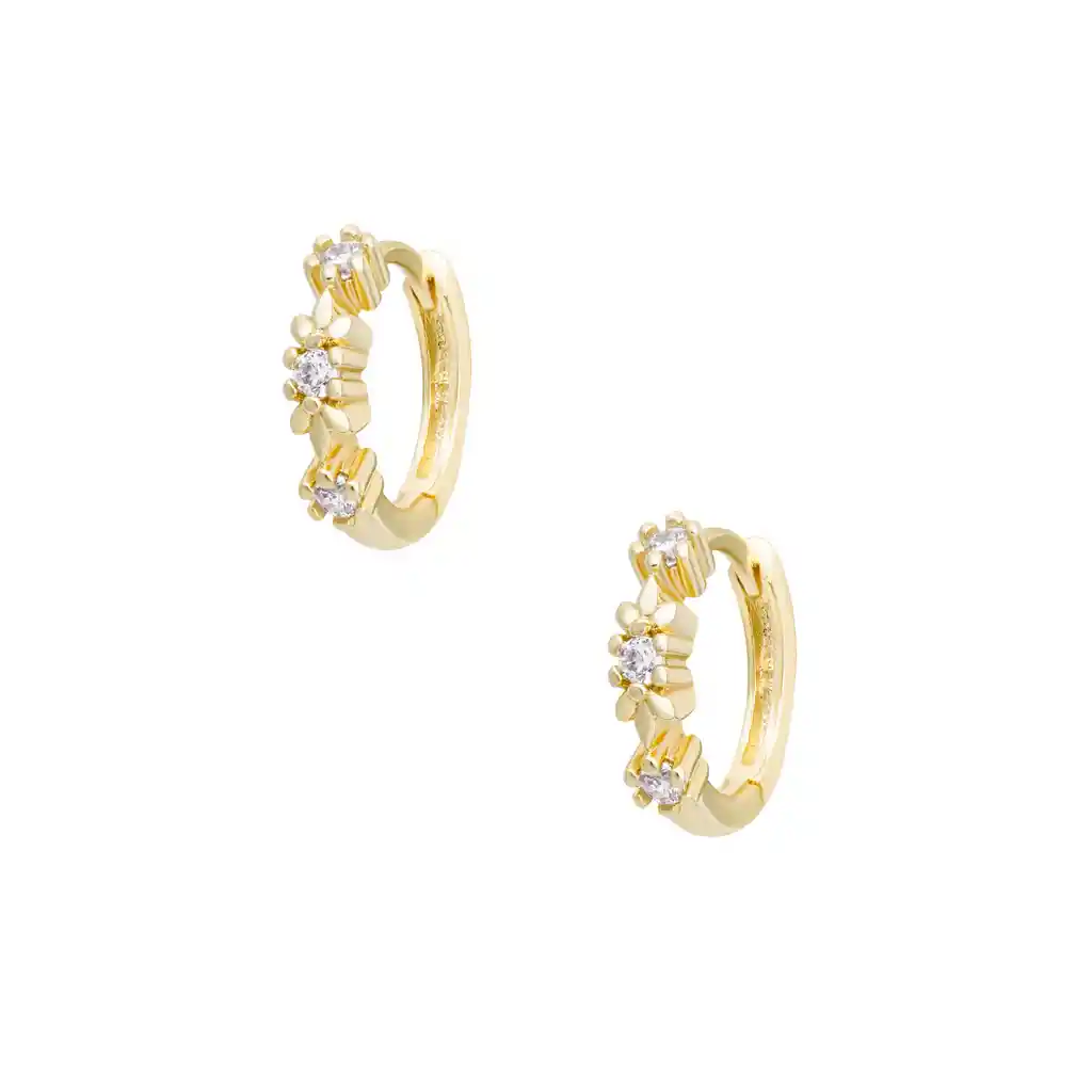 Los Tabit son bañadas en oro de 14k, libres de níquel e hipoalergénicas. Contienen 3 zircones con forma de flores integradas a la argolla... Material: Baño de oro 14k. Diámetro: 11mm. ¡Todas nuestras joyas vienen con un packaging especial que te enamorará!