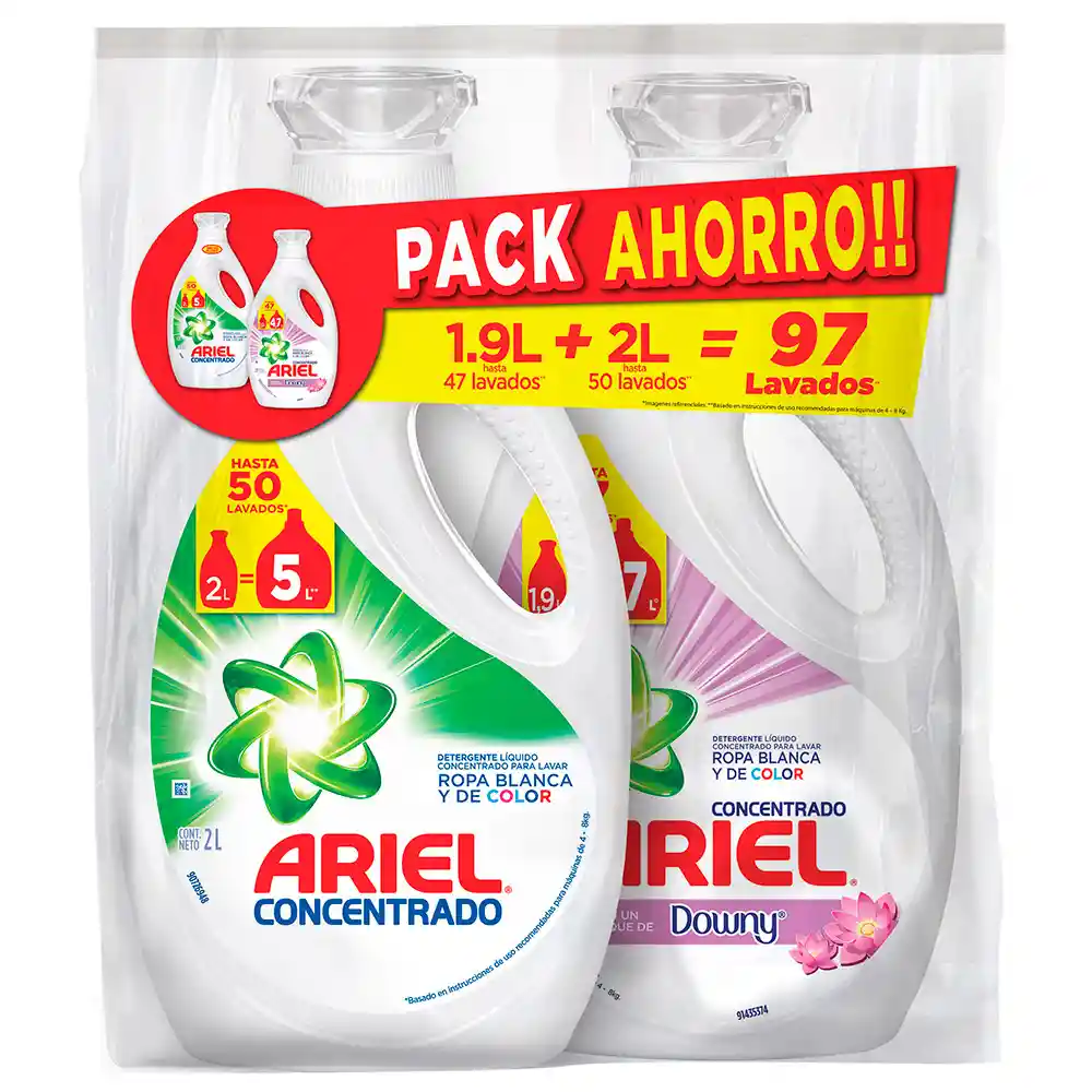 Pack Detergente Liquido Ariel Concentrado 2 Lt + Detergente Liquido Ariel Downy 1.9 Lt