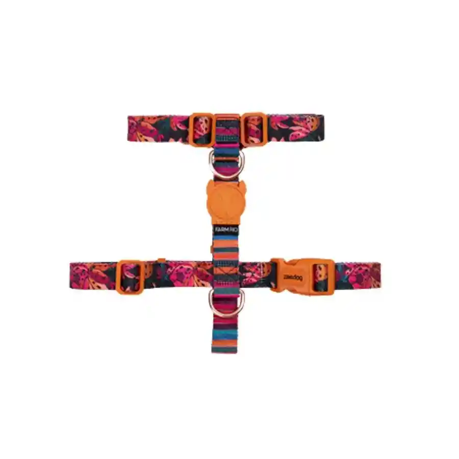 Arnés Zee.Dog para perros: poliéster suave y resistente, doble argolla en “D” para enganchar la correa y broche con bloqueo de 4 puntos para mayor seguridad. Ajuste cómodo y mantención simple.