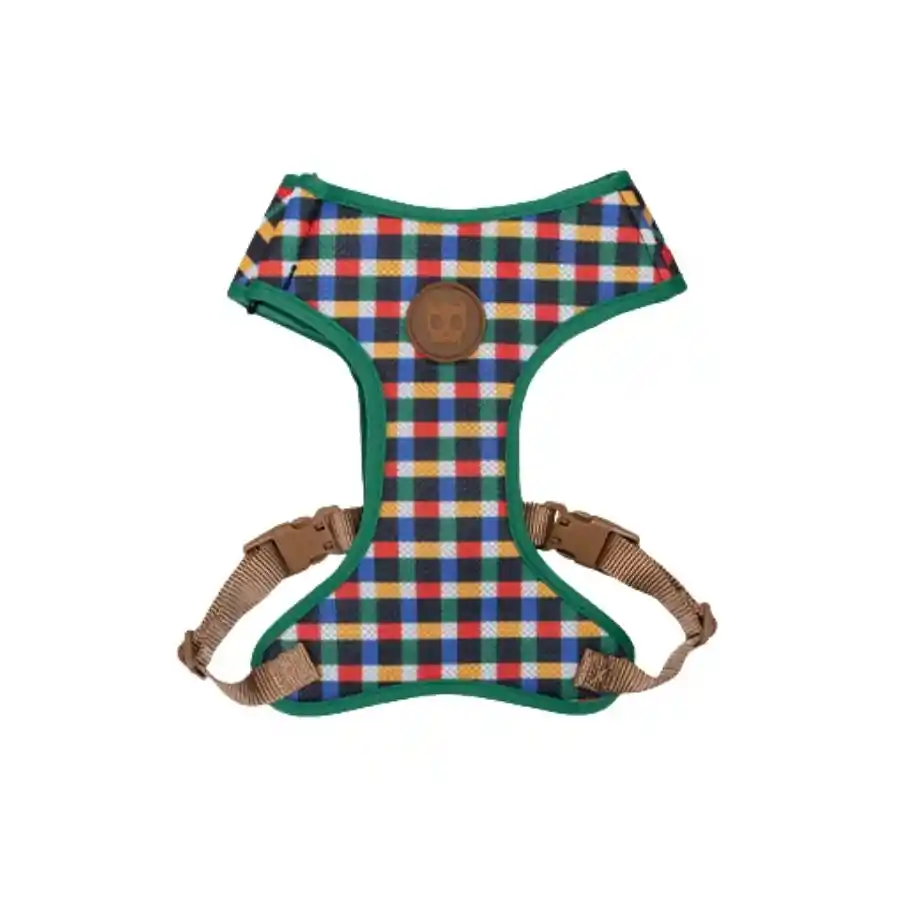 Arnés para perros acolchado y respirable, ajustable en cuello y pecho, cierre de seguridad de 4 puntos y dos argollas en “D” de aleación de zinc. Diseño en colores vivos que no destiñen con agua ni viento; cómodo y resistente para el uso diario.