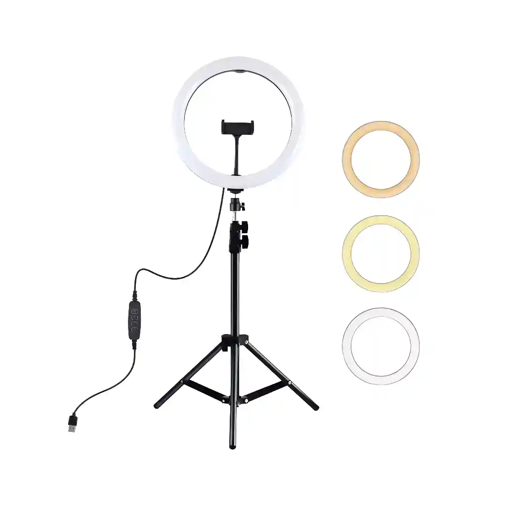 Eleva la calidad de tus videos y fotos con este Aro de Luz LED de 26 cm (10 pulgadas). Incluye trípode atril negro ajustable y soporte para celular, ofreciendo 3 modos de iluminación (cálida, fría y neutra) con intensidad regulable. Su conexión USB permite usarlo con laptops, power banks o adaptadores de pared. Este kit es la herramienta esencial para creadores de contenido que buscan un estudio portátil de alta calidad. Características: Diámetro: 26 cm / 10 pulgadas, ideal para creadores de contenido principiantes. Iluminación: 3 modos de color: frío, cálido y neutro. Intensidad: Regulable para lograr la iluminación perfecta. Alimentación: Conexión USB de 5V (práctica y versátil). Potencia de 12w para un rendimiento óptimo de iluminación. Accesorios: Incluye trípode atril color negro ajustable de 2 metros de altura (Armado). Extras: Soporte para celular incorporado con apertura máxima de 8,5 cm. Importante: No incluye cargador de pared ni smartphone.