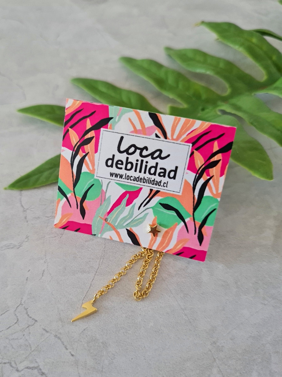 Aro con mini estrella en la base y mini rayo colgando de una cadena. Se vende por unidad. Bañado en oro.