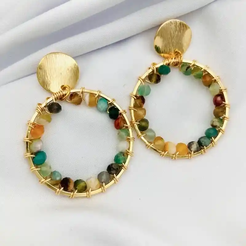 Aros Caroco dorados, "Sol" de Cuarzo/Agata verde entorchado a mano, una argolla de 3cm y disco ondulado con textura, todo con baño de oro de 18k. Largo total 4,5cm.