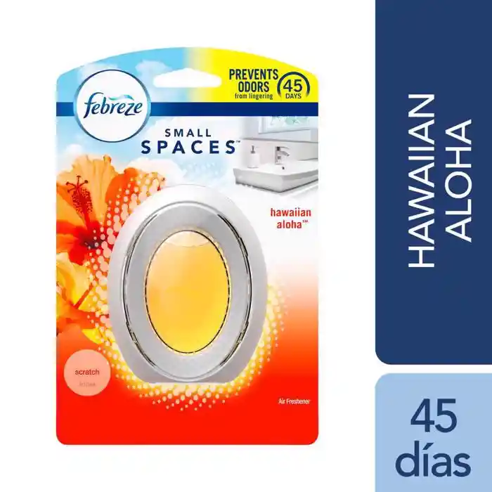Atrapado entre mal olor y un espacio reducido? ¡Sin preocupaciones! Los ambientadores Febreze Small Spaces ahora son más duraderos y evitan que los olores permanezcan por hasta 45 días. Por lo tanto, son el eliminador de olores perfecto y todo en uno para todos esos pequeños puntos que olvidas que necesitan refrescarse: estamos hablando de baños, armarios, el rincón donde vive la caja de arena de tu gato y más. Simplemente presione con firmeza para activar, luego coloque uno donde desee frescura continua ... seguirá eliminando esos olores de habitación pequeña durante 45 días. Con los aromas dulces de piña, melón, durazno y fresia, Hawaiian Aloha te lleva a tu propia isla con todo incluido. Pruebe otros aromas y siga difundiendo esa alegría fresca.
