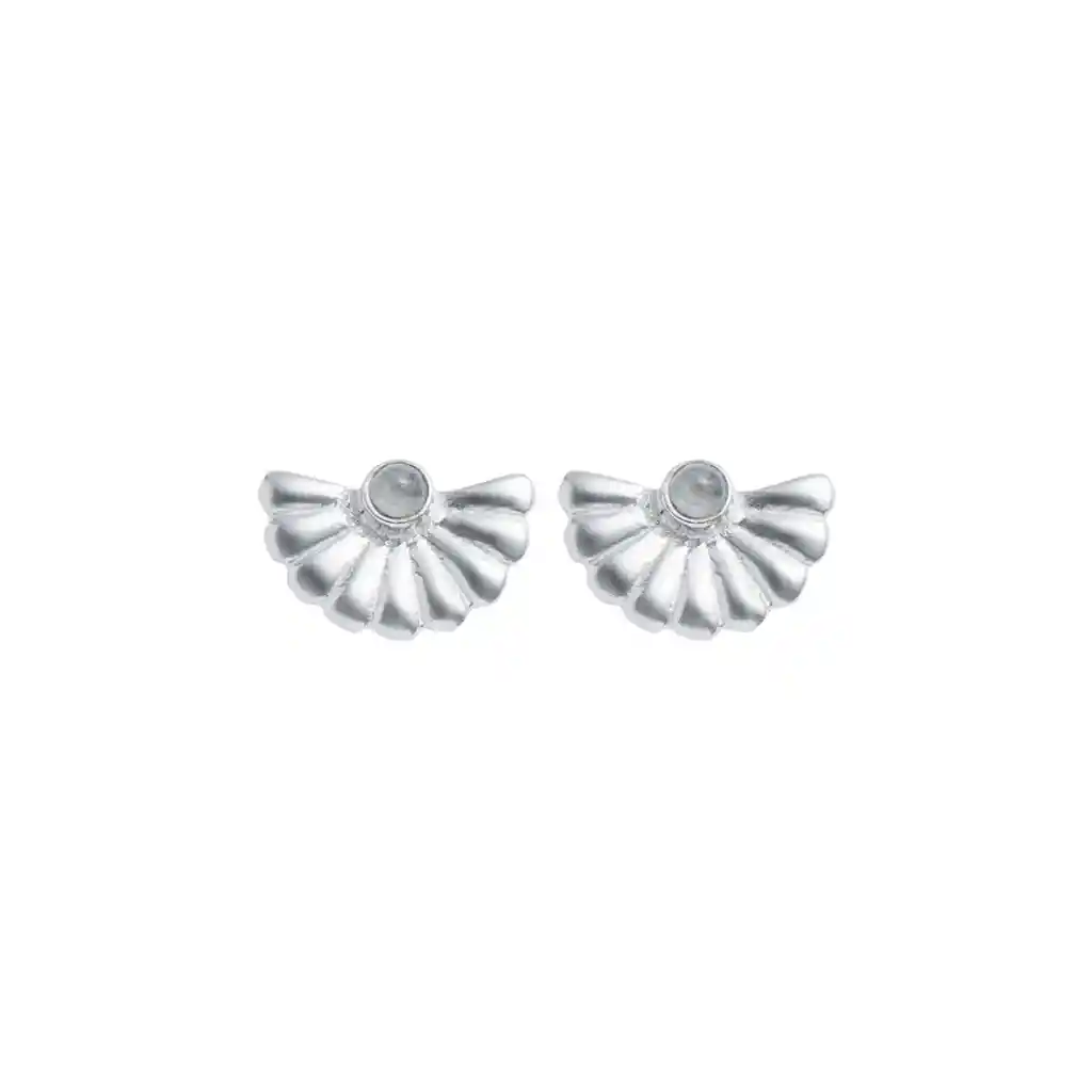 Par de aros en forma de abanico con pequeña piedra natural en forma de circulo, elaborados en plata 925, libre de níquel. Medidas: Largo: 7mm Ancho: 10mm Tipo de broche: tornillo Piedra Luna: Feminidad y cambios