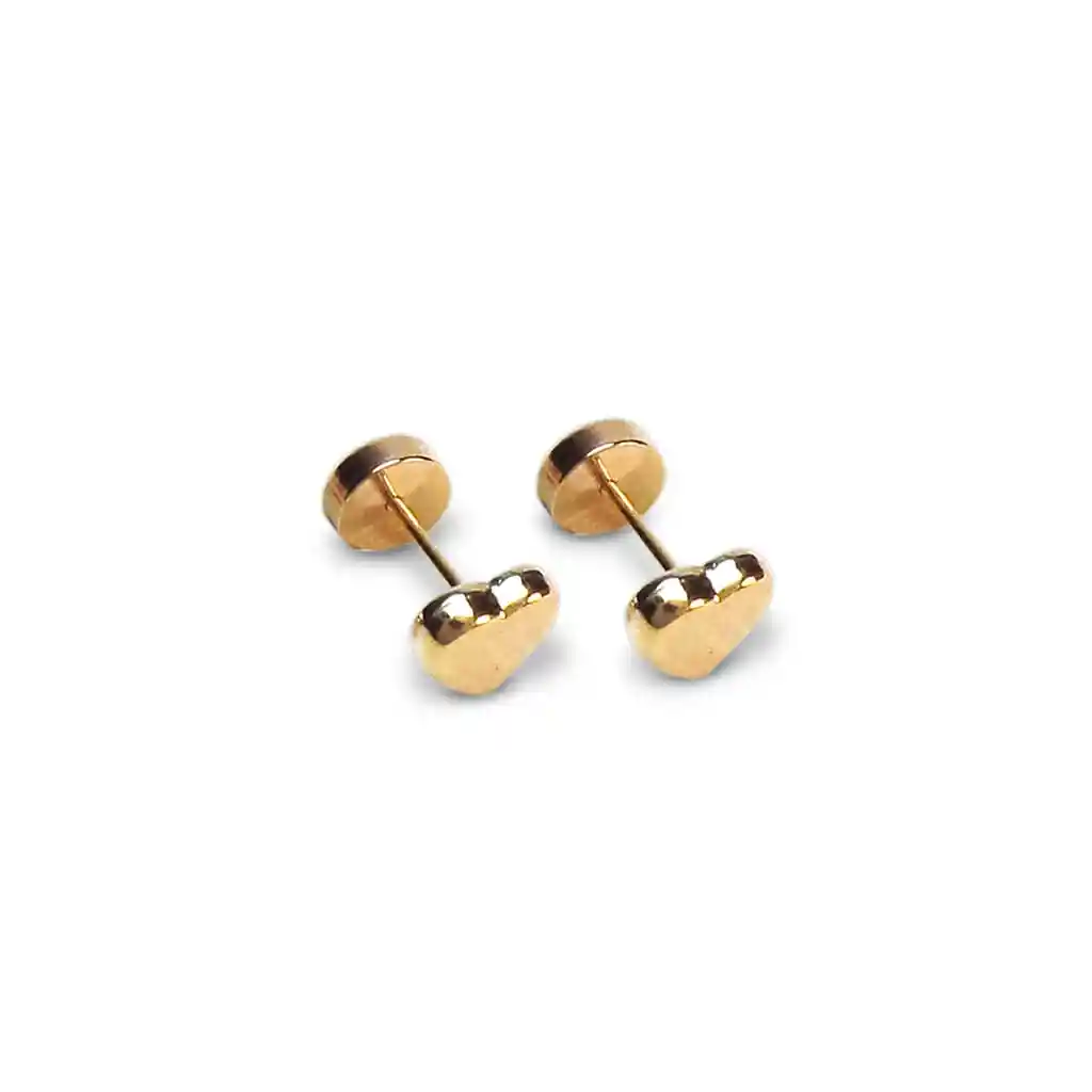Aros abridores bebé corazón con tope a presión seguro Laminado Oro 18 K. Palito Oro 18 K, cuerpo aro Oro 14K. Sus medidas son 5mm de Largo y 6mm de Ancho del corazón. Tiene un peso de 0,7 gr.