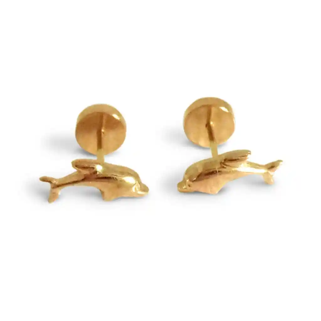 Aros abridores bebé delfín con tope a presión seguro laminado en oro de 18K. Palito de oro de 18K, cuerpo aro oro de 14K. Sus medidas son 10mm de ancho y 3mm de largo del delfín. Tiene un peso de 0,6 gr.