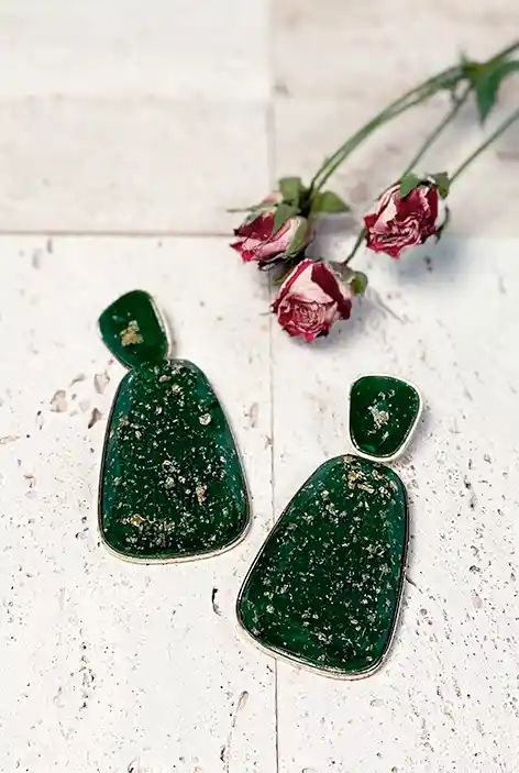 Estos aros destacan por su profundo color verde botella, complementado con sutiles detalles dorados. Engastados en bisel de color dorado, resaltan el elegante tono verde con un brillo sutil, ofreciendo un accesorio tanto llamativo como sofisticado.