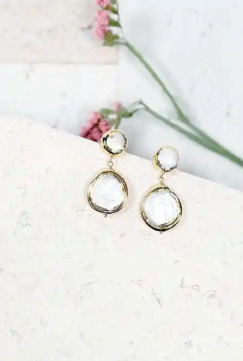 Estos elegantes aros cuentan con perlas de río únicas, destacadas por su forma natural e irregular. Cada perla está engastada dentro de un borde dorado que tiene un diseño sutilmente texturizado, añadiendo un toque de brillo. Esta combinación de perla y oro ofrece un estilo que es a la vez clásico y moderno.