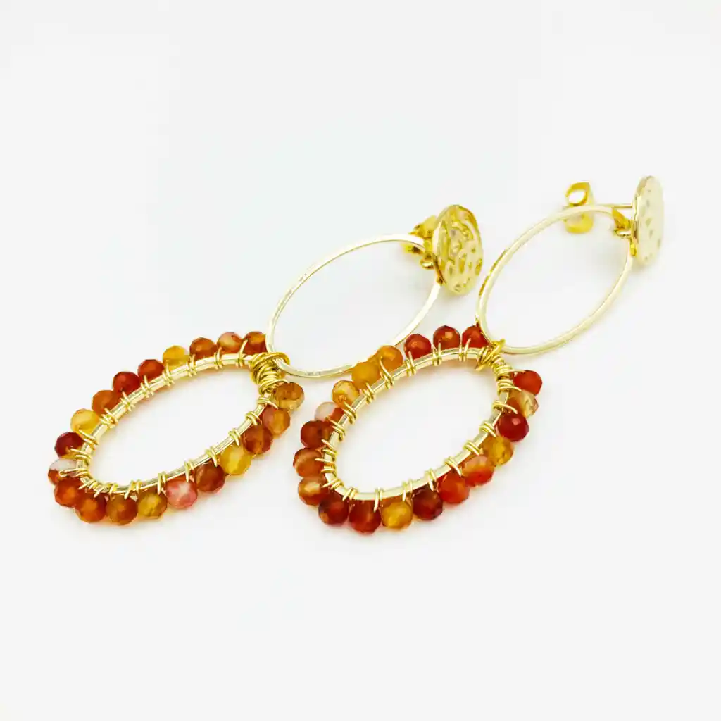 Aros diseño Caroco largos como una flor de Amaranto. Son óvalos y un disco con textura dorados. Entorchado a mano con piedra Agata Cornalina natural. De bronce bañado en oro de18k libre de níquel.