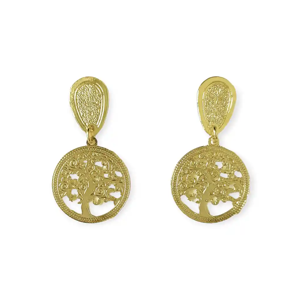 Delicados y hermosos aros árbol de la vida enchapado en oro de 18K. Tienen una aleación de metales, libre de níquel. El material es hipoalergénico. Su calidad es garantizada. Medidas: Largo total de 30mm. Diámetro árbol de la vida 16mm. Peso 1,8 gr.