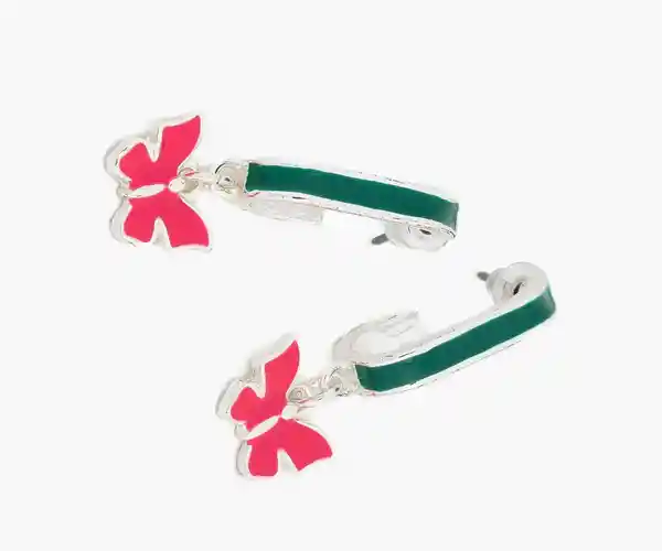 Par. Argollas Plateadas Semi Alargadas Con Detalle de Resina Color Verde y Colgante de Mariposa de Resina Color Rosado Fluor