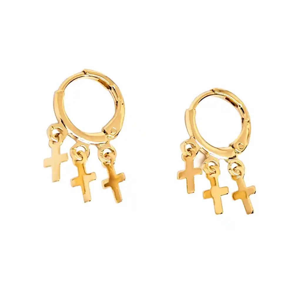 Aros cruces colgantes fabricado en bronce y enchapado en oro 18K. La calidad del material es garantizada. Tiene una aleación de metales y no posee níquel. El material es hipoalergénico. Sus medidas son 11mm de diámetro de la argolla. Las cruces son de 5mm de largo y 4mm de ancho. Tiene un peso de 1,3 gr.