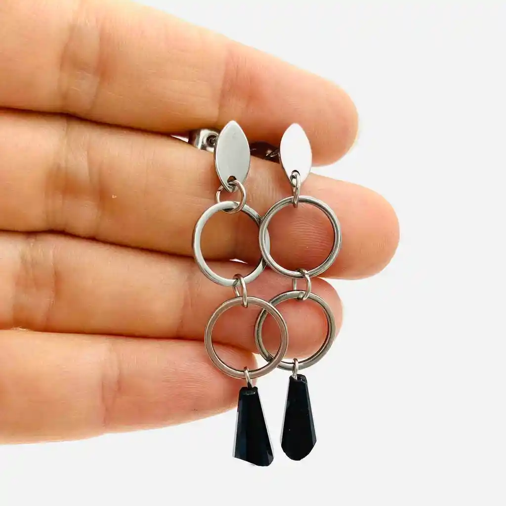 Aros con disco y argollas de acero y con un cristal negro colgando al final.