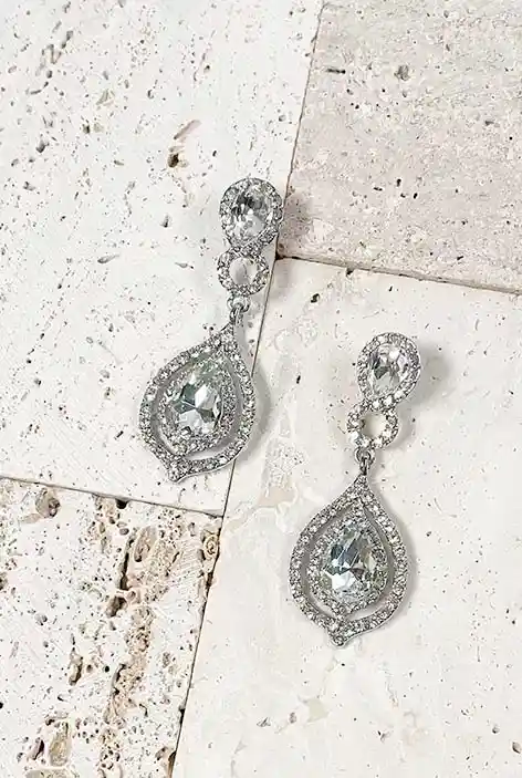 Estos aros de novia tienen una forma de lágrima invertida con detalles de circones que rodean un brillante cristal en el centro. El diseño está cargado de elegancia y brillo, perfecto para un look de alta sofisticación.