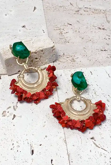 Estos aros únicos combinan la elegancia natural del cuarzo verde, con un toque de color y diseño. El vástago de cada aro está hecho de cuarzo verde natural, engastado en grifa acompañado por un diseño al centro de metal dorado mate que presenta patrones inspirados en el estilo antiguo. Añadiendo un toque de elegancia única, están adornados con mostacillas de piedras en color rojo, tejidas a mano alrededor del borde. La combinación del verde profundo del cuarzo con el rico tono del rojo de las mostacillas crea un contraste precioso y sofisticado.