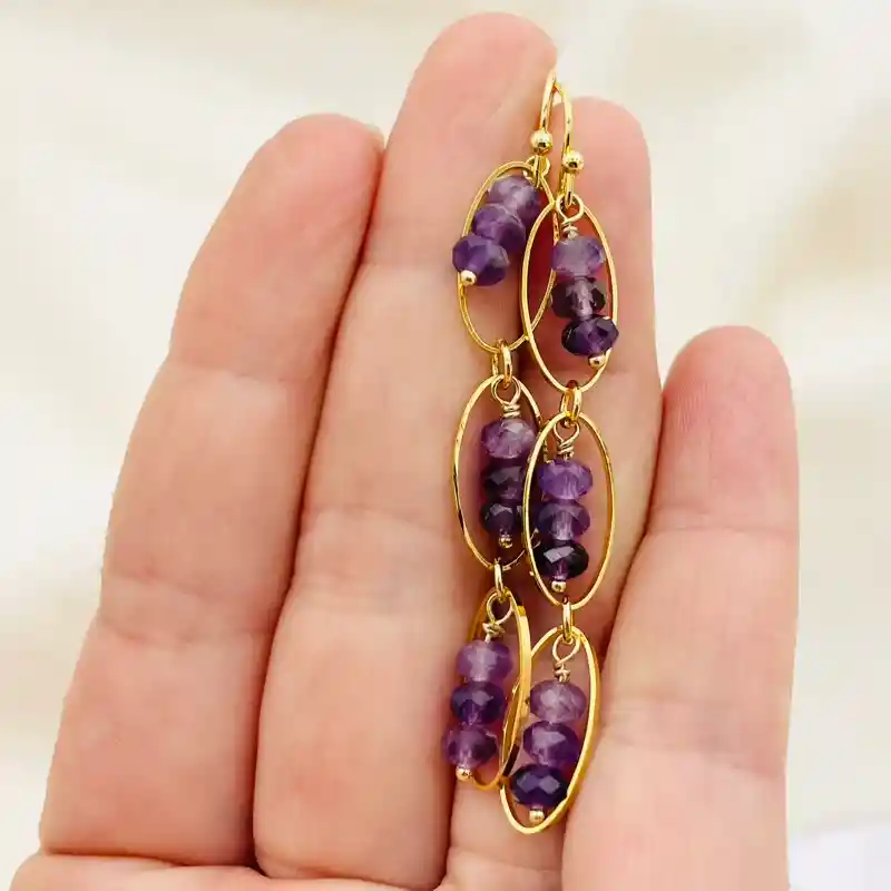 Aros Caroco con piedra Amatista natural, en forma de rondelas de 4x3 facetadas, un gancho simple y 3 argollas ovaladas, todo con baño de oro. El largo total de los aros es de 7cm.