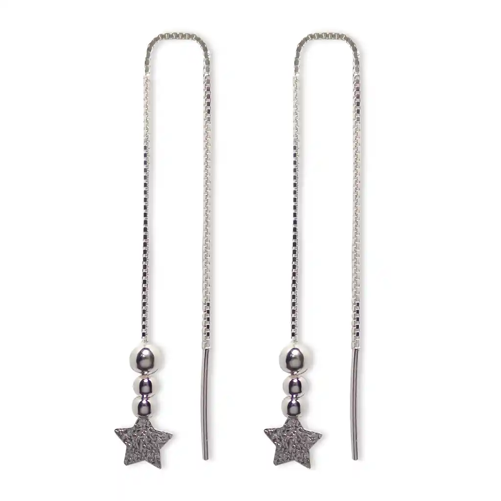 Ilumina tu estilo con nuestros Aros Colgante Cadena Veneciana Estrella en Plata Fina 925. Cada aro presenta una delicada estrella satinada suspendida de una cadena veneciana con bolitas, creando un diseño encantador y femenino. Sus medidas son 110mm de largo. La estrella es de 8mm de diámetro. Tiene un peso de 1,6 gr.