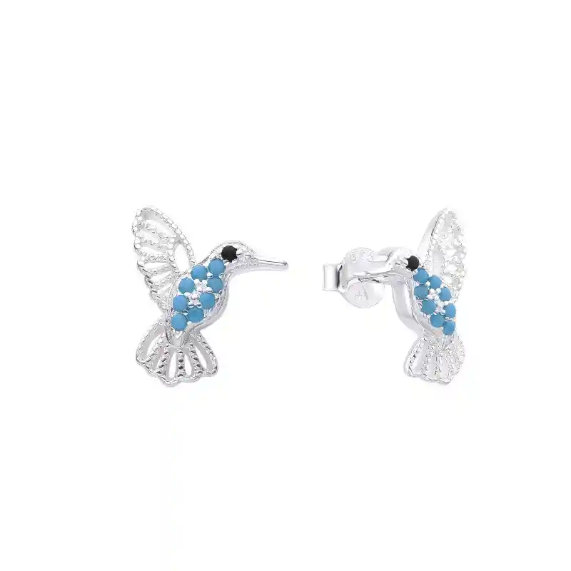 Hermosos y delicados aros en forma de Colibrí calado en las alas y en el cuerpo tiene cristales azules en Plata Fina ley 925 sólida. La calidad del material es garantizada y no posee níquel. Medidas de los aros 13mm de largo y 13mm de ancho. El par de aros pesa 2,2 gr.