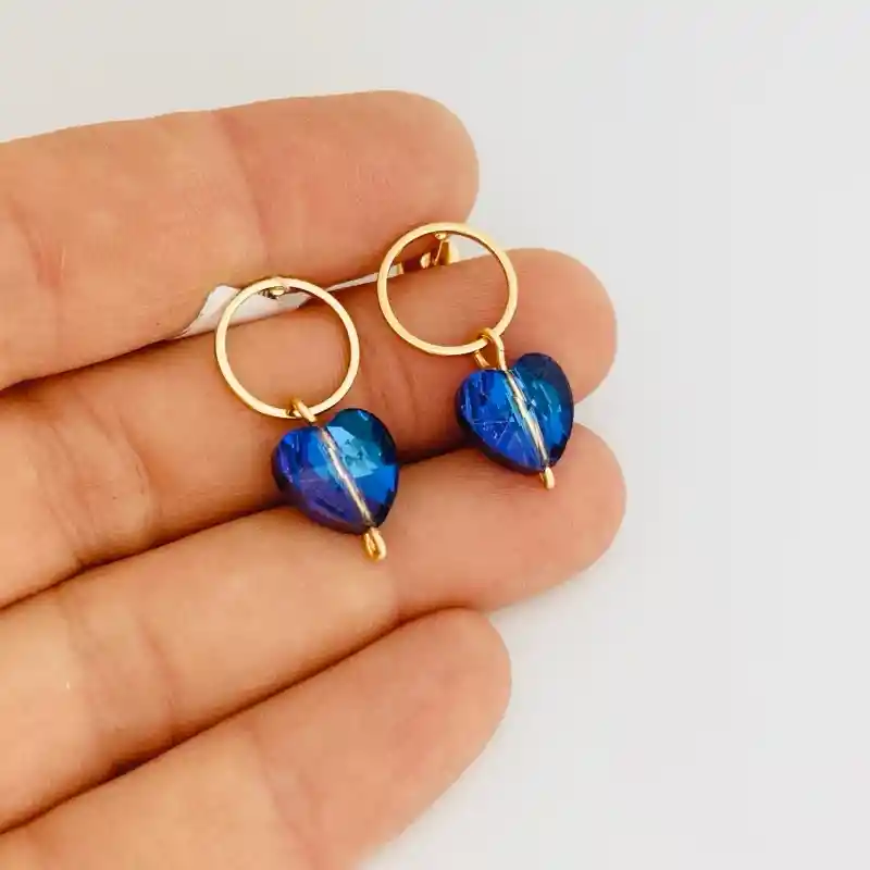 Aros pequeños, con un círculo dorado con baño de oro de 18k libre de níquel, y un corazón de vidrio en un tono azul tornasolado.