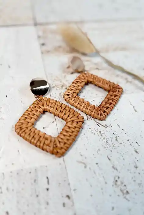 Aros tejidos en rafia de color café, formando una silueta en forma de rombo que les da un toque geométrico y moderno. Son extremadamente ligeros, lo que los hace cómodos para llevar durante todo el día. El vástago metálico dorado añade un contraste elegante y un toque de brillo que complementa la calidez de la rafia.