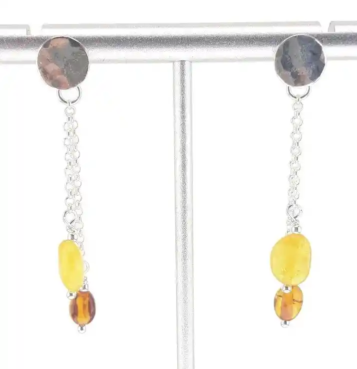 Aros de Ámbar Báltico (Lituania), ovalado liso de 1 cm. Base de aro, doble cadena de 2 cm y conectores de Plata 925. Largo 4,5 cm. Ámbar: purifica y limpia el organismo. Absorbe las energías negativas. Alivia el dolor de encías. Plata: Es antibacteriana. Calma los nervios. Potencia la creatividad. Ayuda a liberar las emociones. Incluye: bolsa de regalo Cambios: 1 mes Garantía: 3 meses