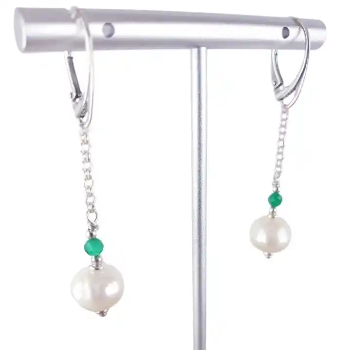 Aros de Perlas de Río, redondas de 1 cm y Piedra Natural de Aventurina, bola lisa de 0,3 cm. Base de aro gancho cerrado de 2 cm, cadena y conectores de Plata 925. Largo: 5,5 cm Perlas de Río: elimina todo tipo de miedos y angustias. Aventurina: tranquiliza la mente, calma la rabia. Disipa las energías negativas. Plata: Es antibacteriana. Calma los nervios. Potencia la creatividad. Ayuda a liberar las emociones. Incluye: bolsa de regalo Cambios: 1 mes Garantía: 3 meses