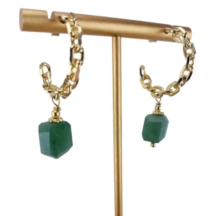 Aros de piedra natural de Aventurina Verde, irregular facetado de 1,5 cm. Base de aro Argolla de 2,3 cm y conectores de Baño de Oro 18K. Largo: 4 cm Aventurina: tranquiliza la mente, calma la rabia. Disipa las energías negativas. Material: Baño de Oro 18K Libre de Níquel Cuidados: No te duches con los accesorios. Evite usar perfumes o cremas directo sobre los accesorios. Se recomienda guardar cada accesorio por separado. Limpiar suavemente con un paño seco. Abrir y cerrar broches con delicadeza. Incluye: bolsa de regalo Cambios: 1 mes Garantía: 3 meses