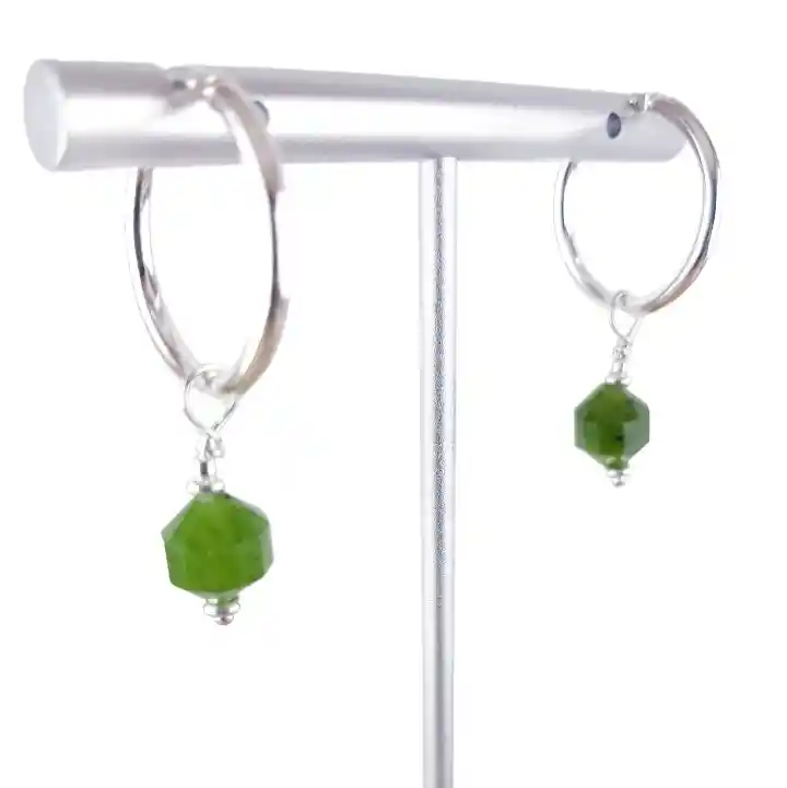 Aros de piedra natural de Jade, bola facetada de 0,7 cm. Base de aro Argolla de 2 cm y conectores de Plata 925. Largo: 3,5 cm Jade: aporta juicio, generosidad y modestia. Purifica de todo pensamiento negativo. Plata: Es antibacteriana. Calma los nervios. Potencia la creatividad. Ayuda a liberar las emociones. Incluye: bolsa de regalo Cambios: 1 mes Garantía: 3 meses