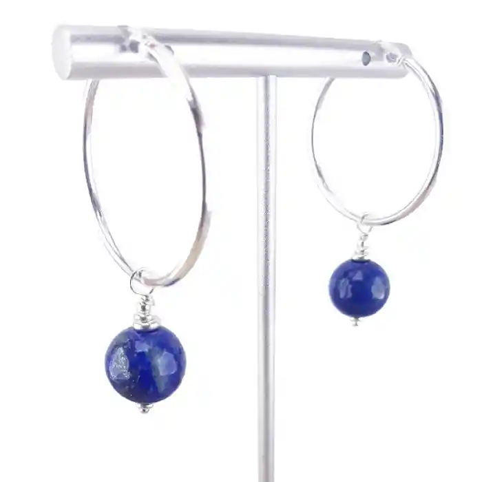 Aros de piedra natural de Lapislázuli, bola lisa de 1,1 cm. Base de aro Argolla de 3 cm y conectores de Plata 925. Largo: 5 cm Lapislázuli: facilita el sueño, transmite paz y serenidad. Plata: Es antibacteriana. Calma los nervios. Potencia la creatividad. Ayuda a liberar las emociones. Incluye: bolsa de regalo Cambios: 1 mes Garantía: 3 meses