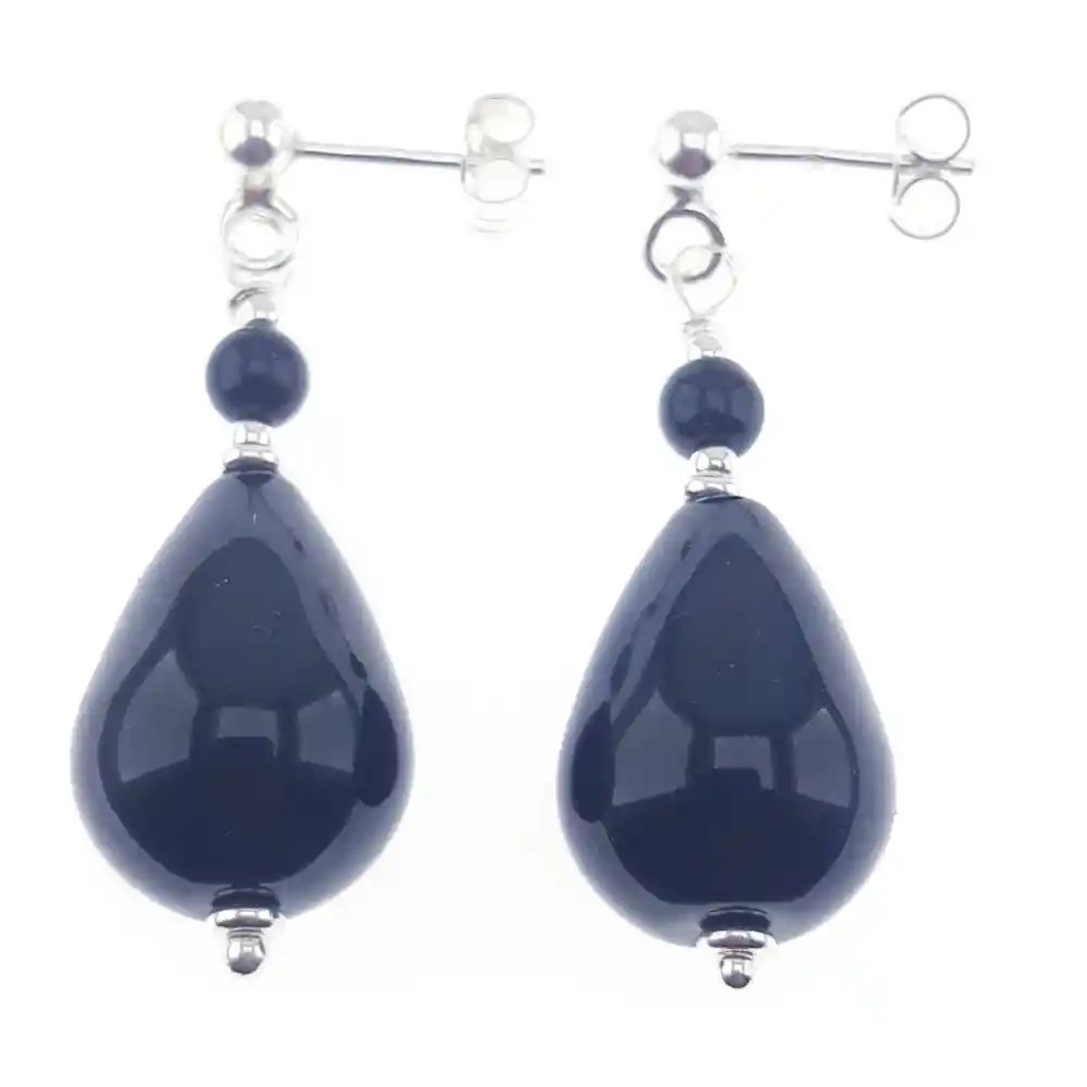 Aros de piedra natural de ónix negro bola lisa de 0,4 cm y gota ovalada lisa de 1,3 cm. Base de aro bola de 0,4 cm y conectores de Plata 925. Largo 4 cm. Ónix Negro: protege contra las malas energías del ambiente y de otras personas. Plata: Es antibacteriana. Calma los nervios. Potencia la creatividad. Ayuda a liberar las emociones. Incluye: bolsa de regalo Cambios: 1 mes Garantía: 3 meses