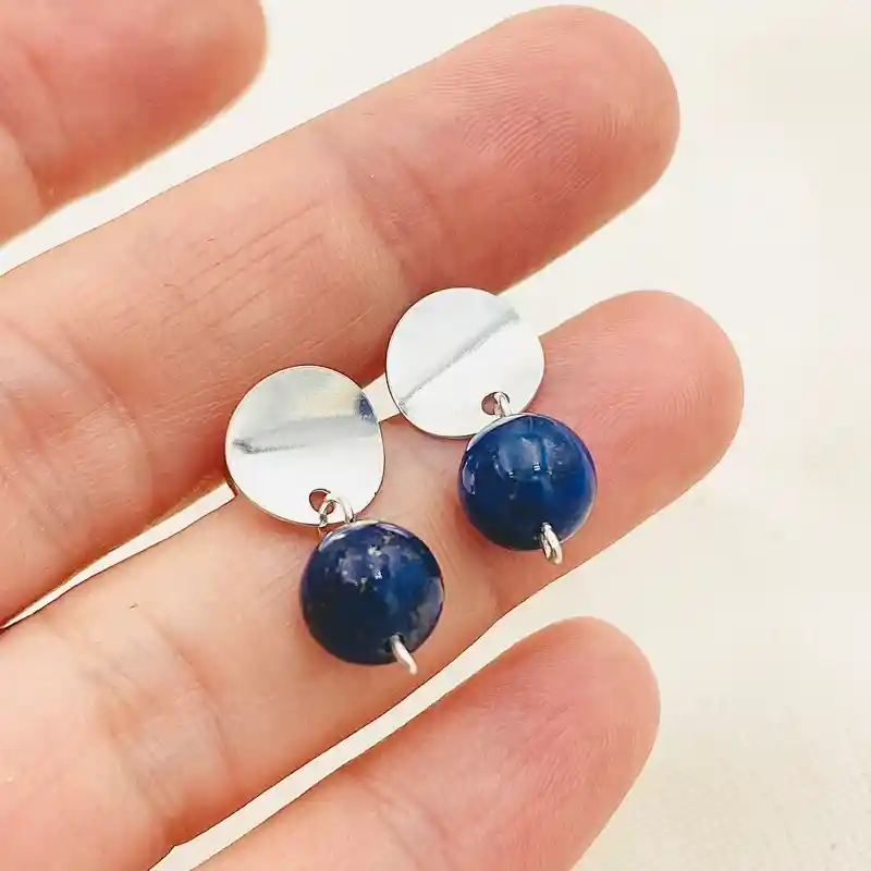 Aros con piedra Lapislázuli en bolita de 8mm., con base en forma de disco brillante y ondulado. Los aros miden 2cm. de largo total.