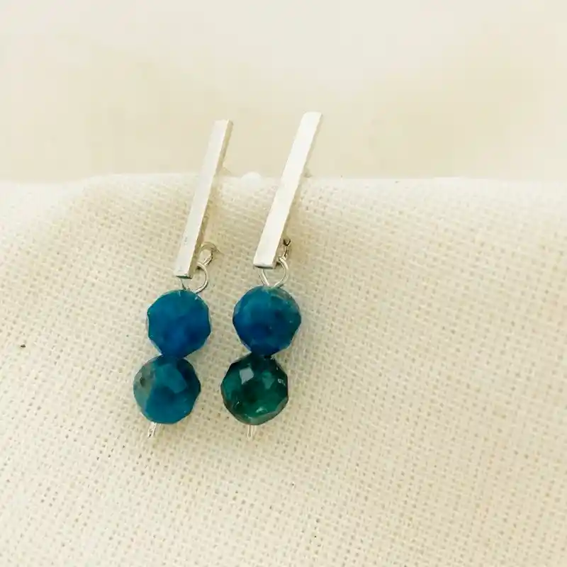 Aros con un palito de plata y 2 piedras Apatita naturales. Los aros miden 3cm. de largo total. La piedra APATITA es utilizada para fortalecer huesos y dientes, regular el apetito y mejorar el sistema digestivo. Potenciadora de la comunicación y la confianza.