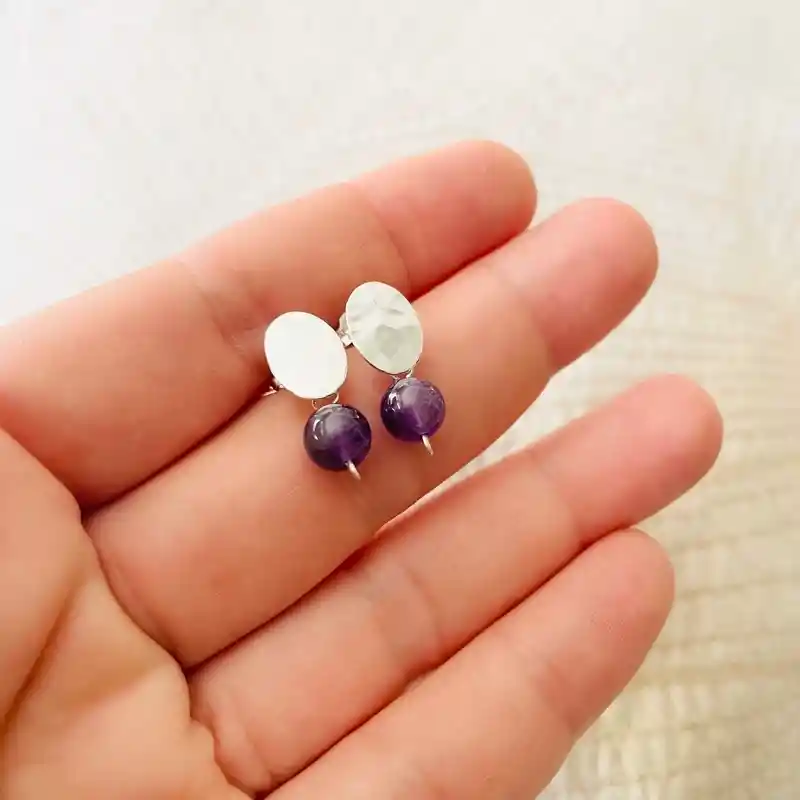 Aros pequeños con un óvalo martillado de plata y una piedra Amatista natural de 6mm. Los aros miden 1,8cm. de largo total.