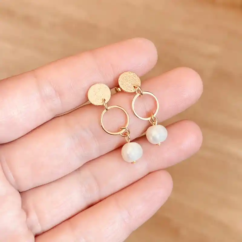 Aros Caroco argollita y disco textura dorados con una perla mini natural. Bronce con baño de oro de 18k libre de níquel. 2,4cm de largo total.
