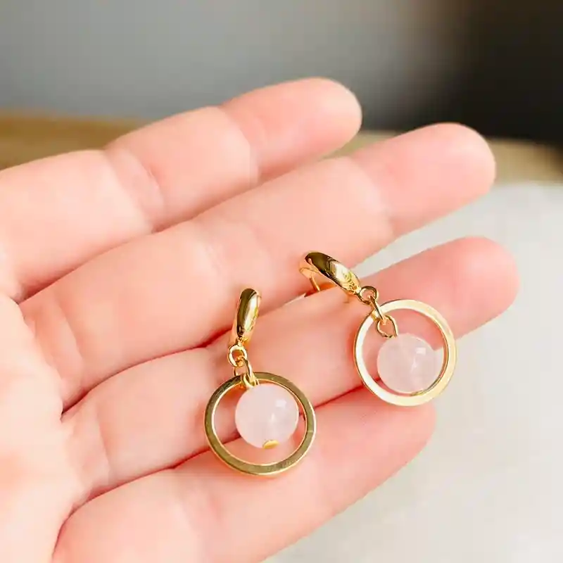 Aros dorados con argolla colgante y un Cuarzo rosa natural. Bronce con baño de oro de 18k libre de níquel.