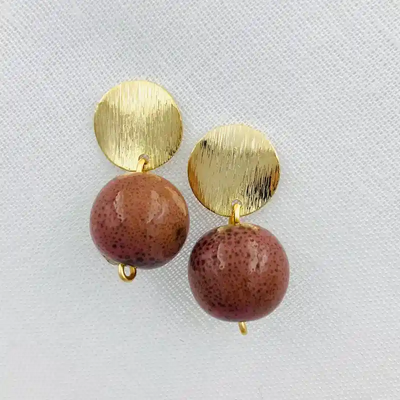 Aros disco con curvas de bronce bañado en oro con una bolita de Ceramica en color ladrillo. Largo total 2,6cm.