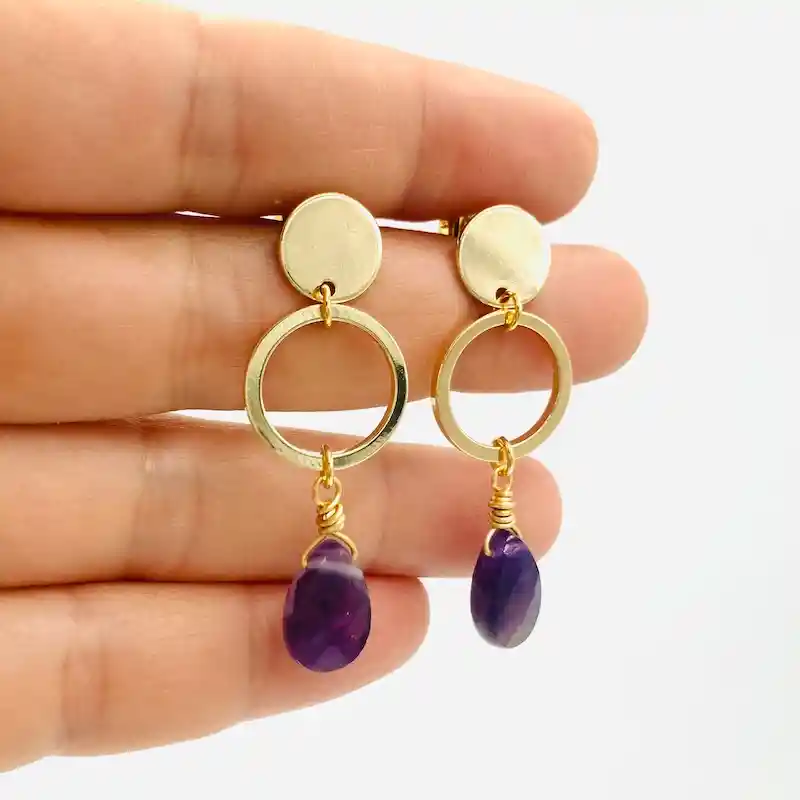 Aros Caroco, Amatista natural en forma de gota, disco y argolla dorados con baño de oro. Largo total de los aros: 4,5cm