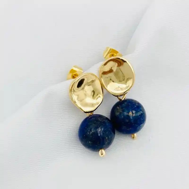 Aros Caroco dorados pequeños con baño de oro de 18k libre de níquel. Los aros tienen un disco de forma irregular y ondulado, dorado y brillante, con piedra Lapislázuli natural de 1cm. de diámetro. Los aros miden 2,5cm de largo.