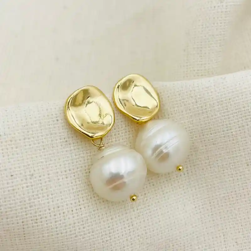Aros dorados con perlas gorditas y con textura de rayas. Un disco ondulado y de forma irregular, brillante, con una perla natural cultivada. Los aros miden 2,6cm. de largo total.