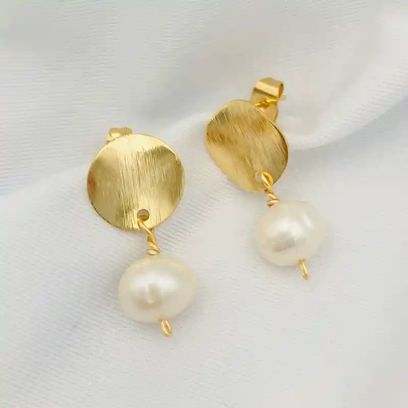 Aros Caroco con un disco ondulado y textura rayada, con una perla blanca 8mm natural - baño de oro - Largo total aproximado 2cm.
