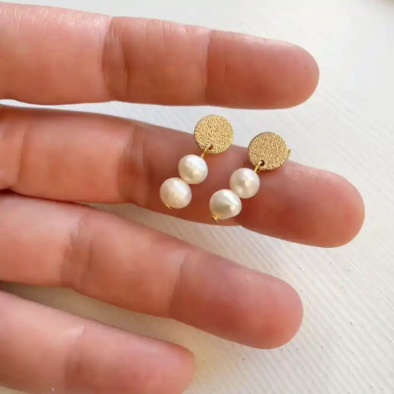 Aros Caroco con perlas naturales cultivadas, un disco mini con textura dorado y 2 perlas de 6mm. cada una aprox. El largo total de los aros es de 2,2cm.