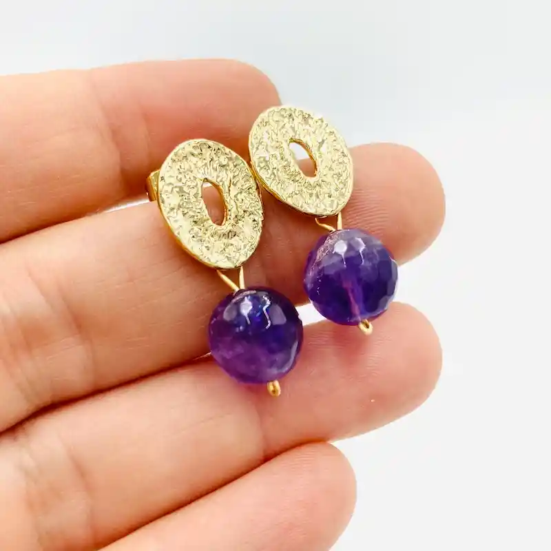 Aros Caroco dorados con piedra Amatista natural de 1cm. facetada. Óvalo con textura de 1.5x1.2cm bañado en oro de 18k. libre de níquel., Largo total de los aros: 2,6cm.