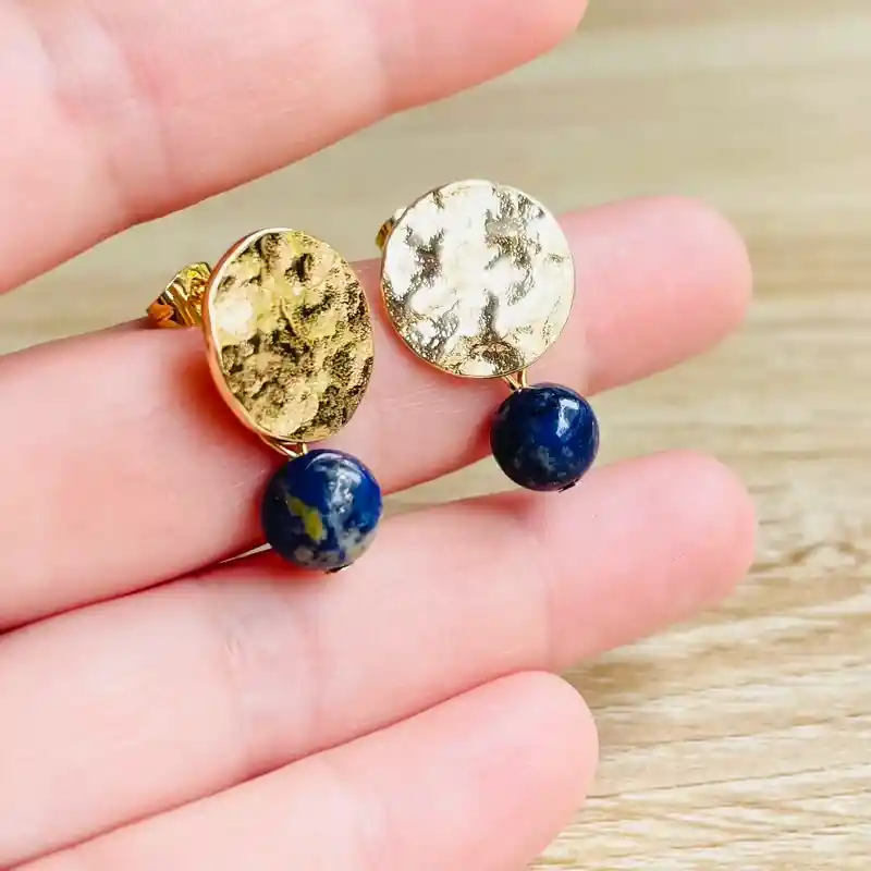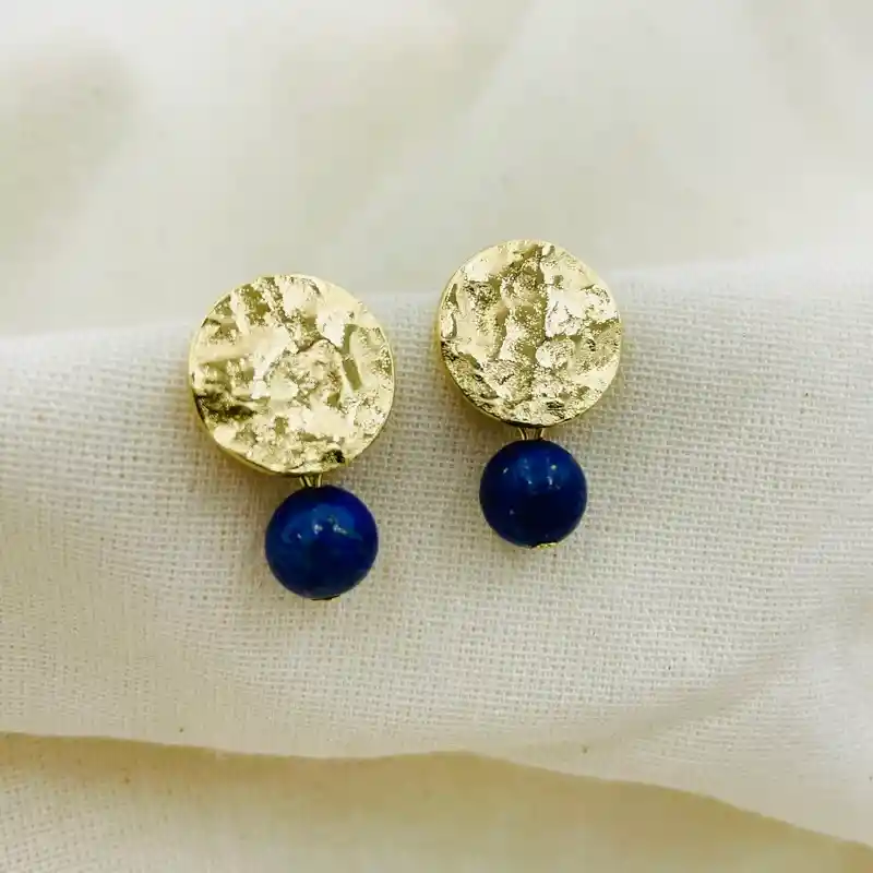 Aros con un disco dorado con textura de aproximadamente 15mm. y una piedra Lapislazuli natural de 8mm.