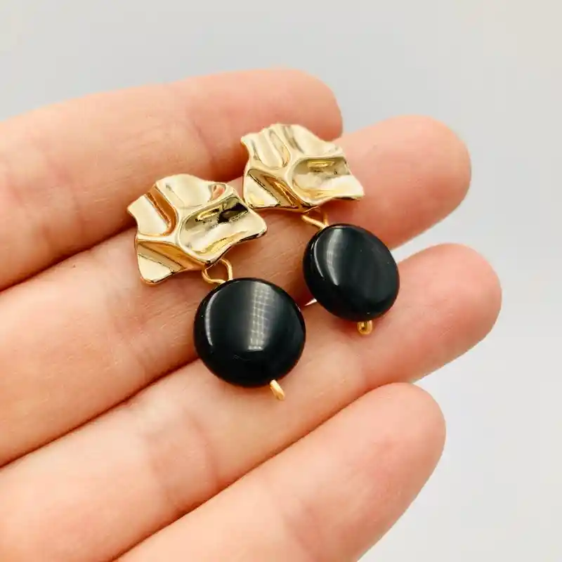Aros Caroco, con una figura de forma irregular y ondulada, con una piedra Obsidiana natural de forma redonda y plana. Largo de los aros: 2,6cm Baño de oro de 18k.